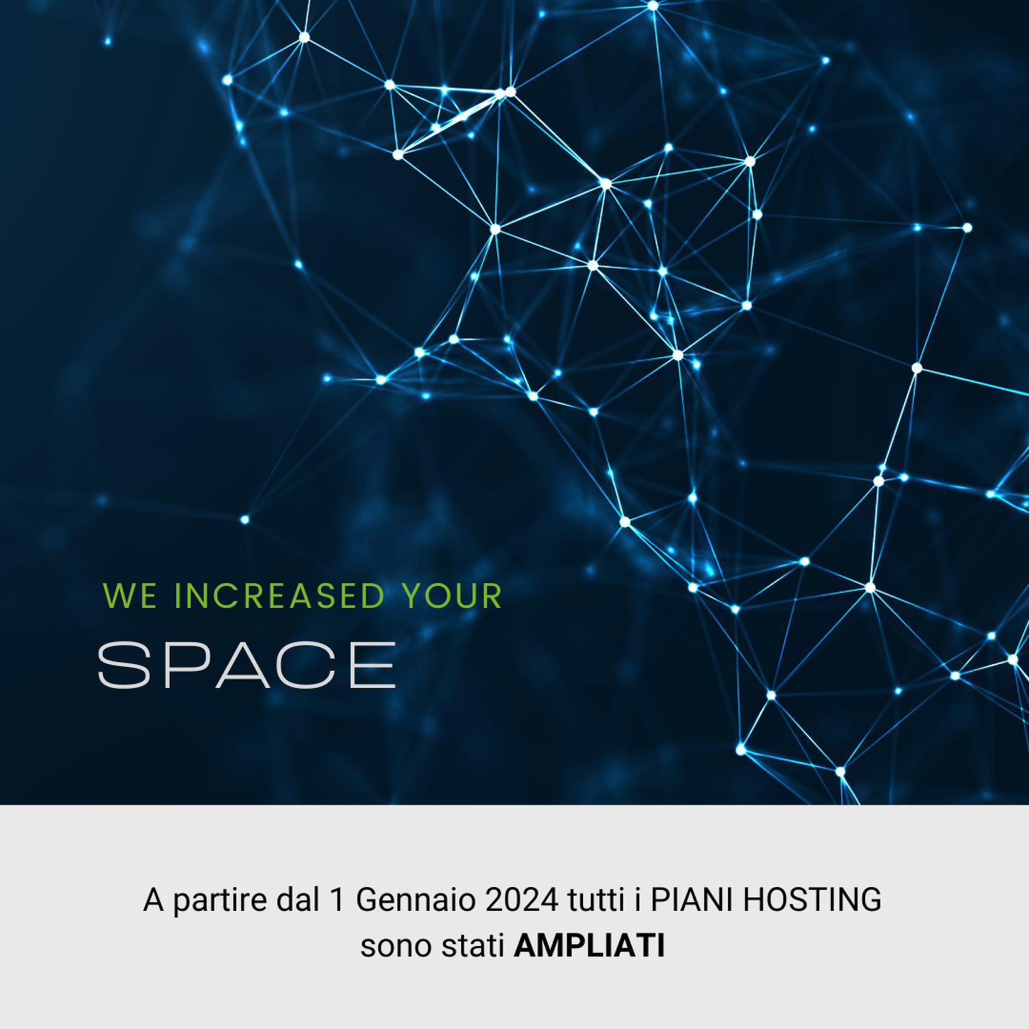 A partire dal 1° gennaio 2024, il nostro staff tecnico ha apportato importanti cambiamenti ai profili Hosting, ampliando la quota disco di tutti i piani.