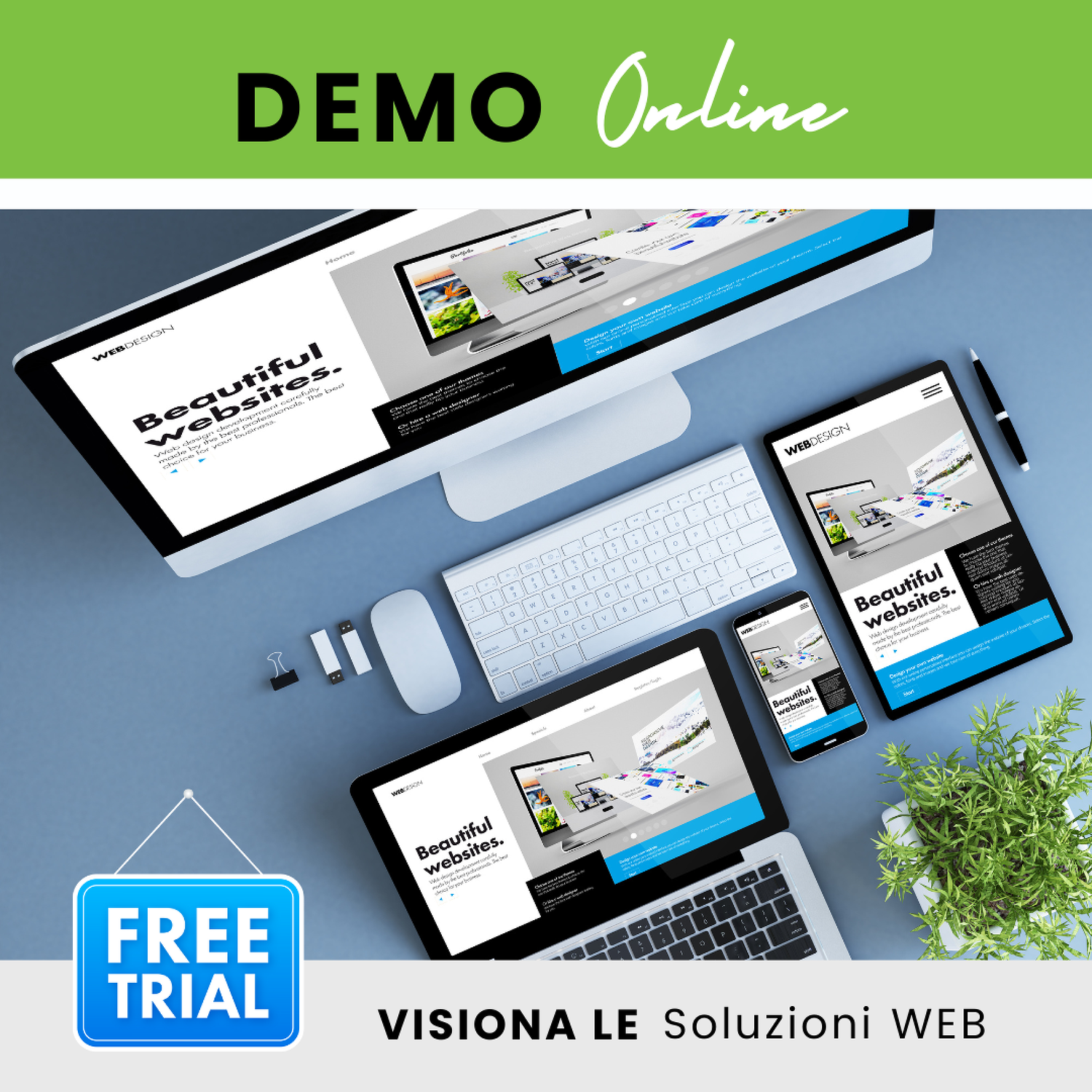 DEMO SECTION ospiterà svariate soluzioni web, dalla semplice ONEPAGE a siti più strutturati, E-commerce, Web App collegate a gestionali aziendali e molti altri applicativi. Ogni soluzione Web, dal Sito Base alle Web App più strutturate, sarà presentata con una descrizione dettagliata delle sue funzionalità e dei suoi vantaggi, accompagnata da un'interfaccia di Amministrazione che vi permetterà di provarla e testarla in ogni suo aspetto.